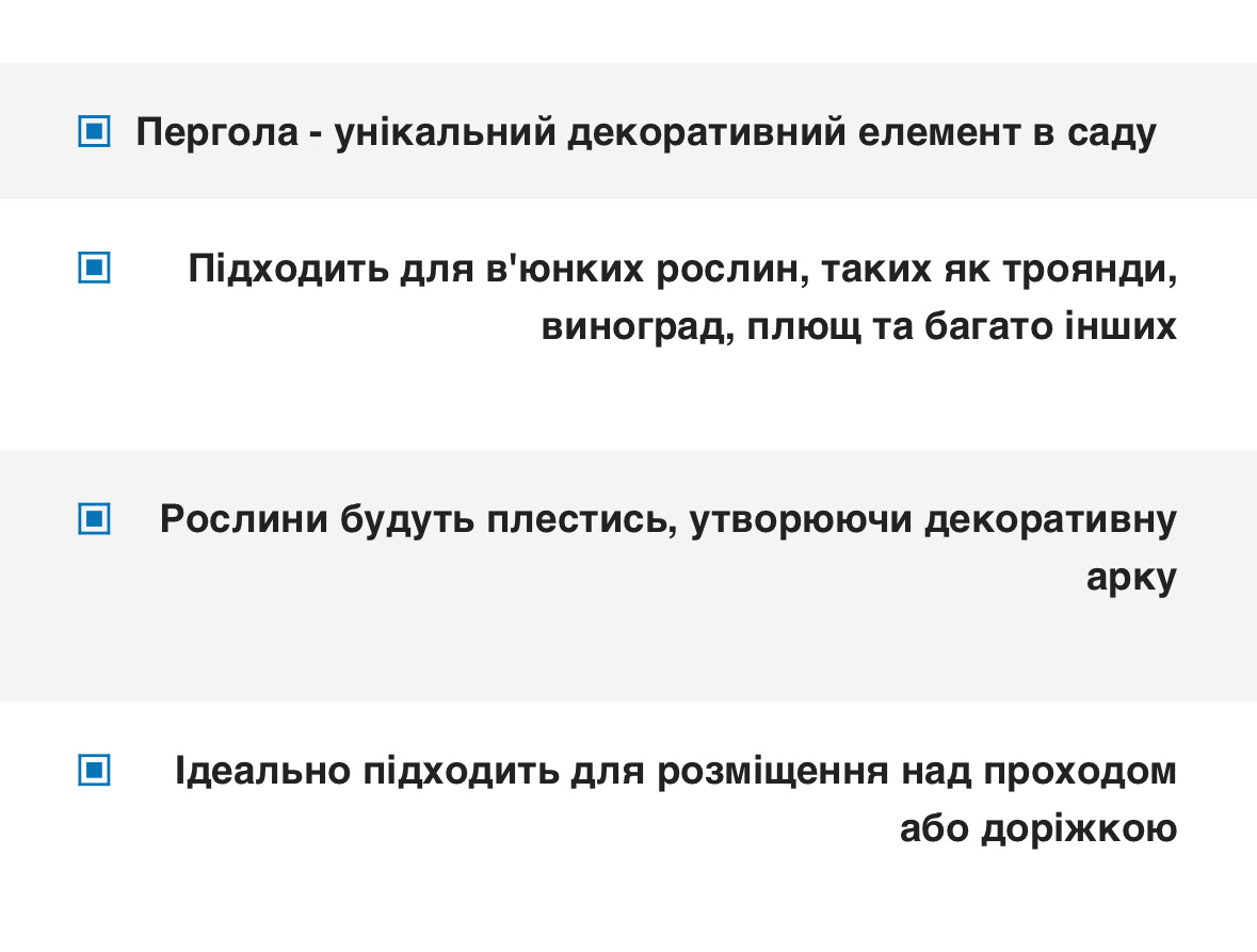 Пергола - основа оригінальних дизайнерських рішень. Завдяки цій конструкції рослини будуть плестись, створюючи декоративну арку. Пергола підходить як для саду, так і для балконів, терас або просторем над хвіртками, а розмістивши кілька пергол, можна створити гарну алею.